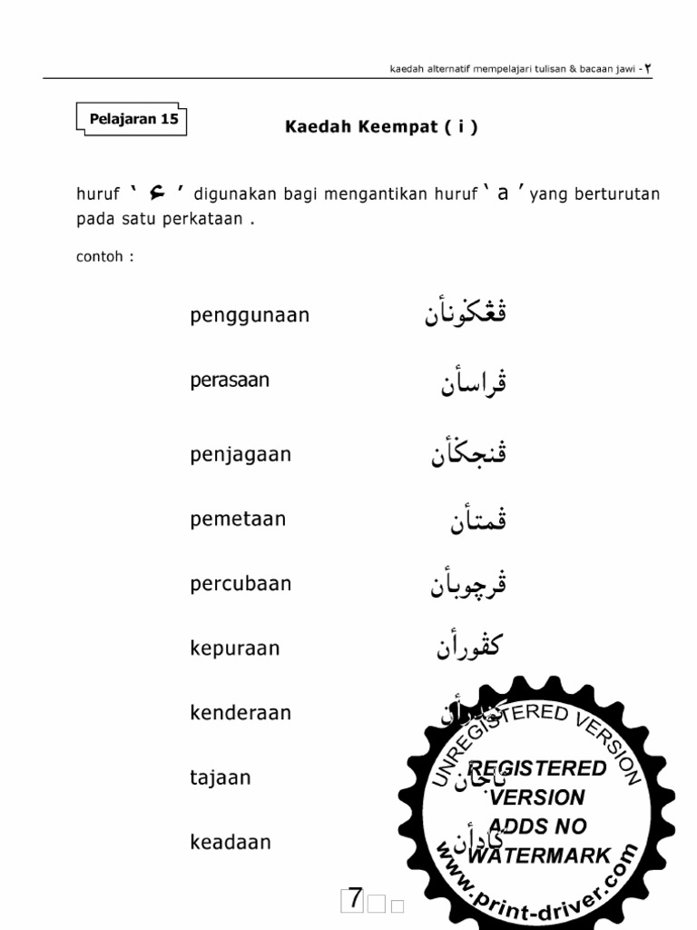 Pelajar juga perlu mengetahui satu huruf tunggal jawi ada 4 bunyi yang berlainan 75. Atukarkan huruf rumi kepada huruf jawi b. Hazman selanjutnya menjelaskan walaupun berkongsi huruf sama tulisan jawi dan arab tetap dua perkara yang berbeza. Menentukan huruf vokal yang perlu digugurkan atau dikekalkan 35.